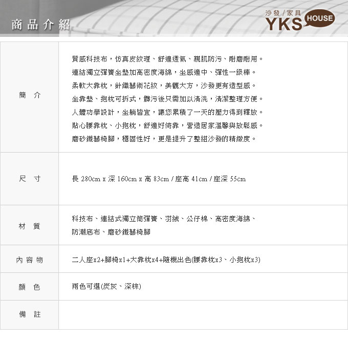 科技布耐汙耐用、舒適透氣,獨立筒座墊彈性好、坐感好,配色大靠枕美觀大方,磨砂鐵藝椅腳,穩固性好,移動式腳椅輕鬆變換左右型,空間運用更靈活